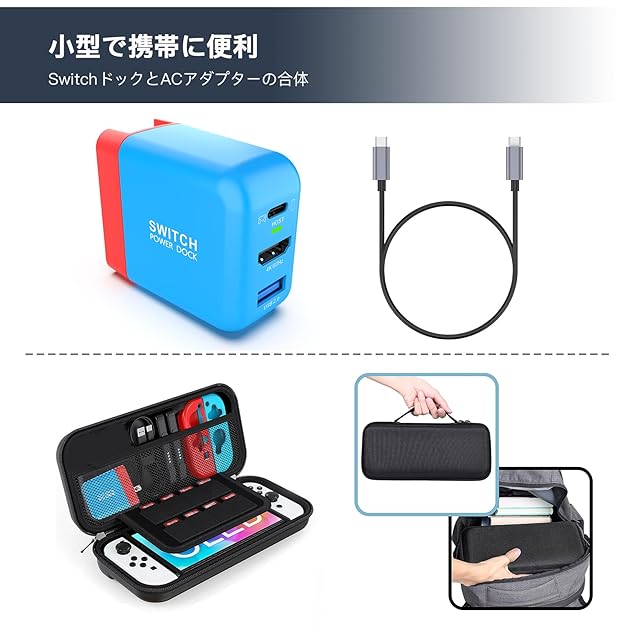 【コンパクト・軽量】Switch ドックの機能がポケットサイズに凝縮。従来のSwitch ドックに備わっている機能をそのままに、サイズだけを三分の一に凝縮した持ち運びがとても便利な製品です。サイズが65×60×27mm、重量95gと超軽量。コンセントに差し込むプラグは本体に収納出来ますので、パケットに入る大きさで、カバンに入れても引っかかりません。AC100-240V/1A Maxの入力電圧対応、海外旅行・出張する場合、目的先のプラグを付けると安心でご利用いただけます。