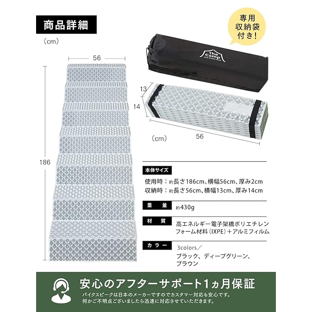 ?【仕様 / セット内容 /メーカー】【仕様】本体サイズ:(約)幅56cm×長さ186cm×厚さ2cm(使用時)、幅13cm×長さ56cm×厚さ14cm(収納時)、重量:約430g、材質:IXPE(高エネルギー電子架橋ポリエチレンフォーム)+アルミフィルム【セット内容】本体×1、収納袋×1【メーカー】PYKES PEAKは日本のメーカーです。カスタマー対応も日本人スタッフが日本語で丁寧に対応いたします。初期不良や故障などの場合は、ご気軽にご連絡ください。製品を含めご対応させて頂きます。