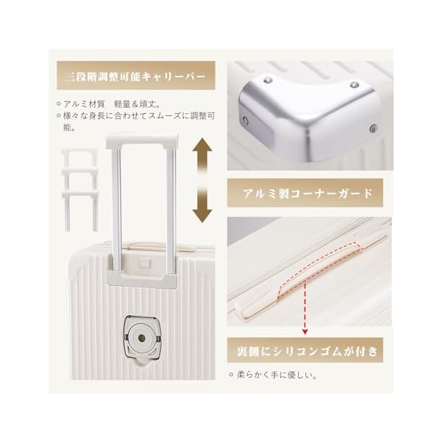 【TSAロック コーナーパッド】海外旅行の際も施錠したまま荷物を預けられるTSAロックを搭載。工場から出品した後、TSAロックはロックされていませんでした。矢先の方向を向かって、ボタンを押して、スーツケースを開けてください。鍵はスーツケースの中にあります。鍵をしっかり保管してください!