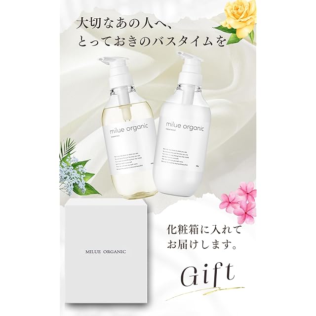?【バスタイムでうっとり癒し】オーガニックのやさしい香りの中でも、金木犀の華やかな香りがしっかりと広がり、アロマのような心地よさを感じていただけます。頭皮ケアから美髪までしっかりサポートし、エイジングケアも叶えるシャンプーセットは、milue organic のロゴ入り化粧箱入り。忙しい毎日を過ごすあの人へ、癒しの贈り物としてもぴったりです。