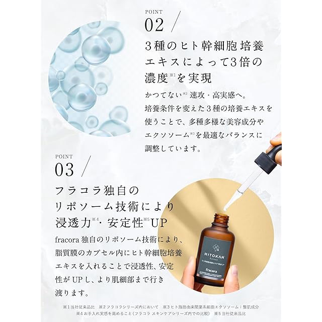 【フラコラ独自の技術で 3種類のヒト幹細胞 培養エキス※1を 配合し濃度が3倍※2に!】培養条件を変えた3種の培養エキスを使うことで、 多種多様な成長因子やエクソソーム※3を 最適なバランスに調整。 フラコラならではの培養エキスに仕上げています。 幹細胞をパワフルに活性化※2し、 かつてない※4速攻・高実感へ。 ※1 ヒト幹細胞順化培養液、ヒト脂肪由来幹細胞順化培養液、 ヒト脂肪間質細胞順化培養液:整肌成分 ※2 成分の活性のこと ※3 ヒト脂肪由来間葉系細胞エクソソーム:整肌成分 ※4 フラコラシリーズ内での比較