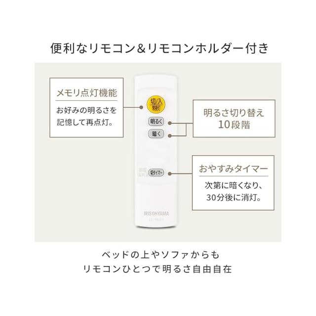 調光(明るさ)調節10段階シーンやお好みによって、明るさを調整できます。Ra85の高い演色性で、肌や食べ物の色がより美しく自然に。お好みの明るさを記憶して再点灯する明かりメモリ機能搭載。
