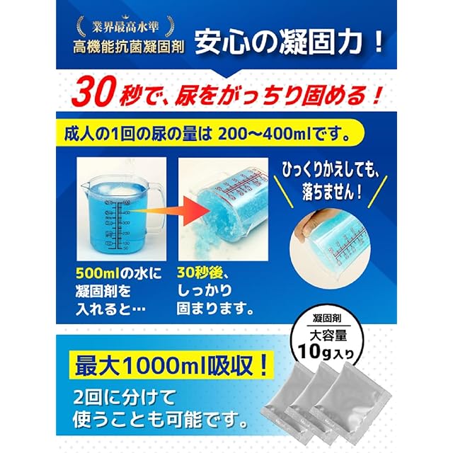 【安心の凝固力!】 弊社の凝固剤は10g入っています。 1リットル以上吸水することができるので、一袋で2〜3回吸収することができます。
