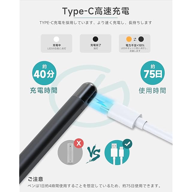 ・革新的なType C急速充電&長時間使用・Metapen Surface用タッチペン M1は 最先端のUSB C急速充電を採用しています、単6電池を使用する多くのブランドとは異なり。高速充電と長いバッテリー寿命を享受する、完全に充電して300時間以上継続して使用するには、40分しかかかりません! 充電1分=作業15時間。充電5分=作業80時間。初めて使用する前に10分間充電してください。この surface タッチペンは、メモを取ったり絵を描いたりすることが必要な学生、クリエイター、会社員の方に最適です。ご家族、恋人、友人、同級生、自分などに準備した最適な新年と成人の日のプレゼントです。