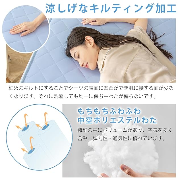 【キルティング加エ】細めのキルトにすることでシーツの表面に凹凸ができ肌に接する面が少なくなります。それに洗濯しても均一に保ち中わたが偏らないです。