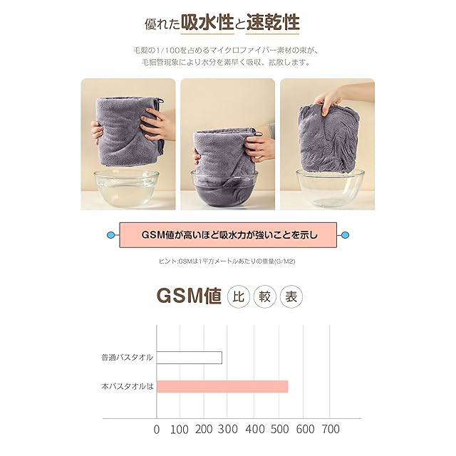 【優れた吸水性と速乾性】綿素材より吸水性に優れています。 マイクロファイバー素材の表面には無数の隙間があり、大量の水分を素早く吸収します。 優れた通気性と速乾性で注目を集めています。 髪や肌に塗るだけで水分を吸収できます。 梅雨や湿気の多い季節でも、乾き早くていつも清潔を保ちます。 隙間の空気が湿気を拡散するので、乾きにくい衣類でもご使用いただけます。 室内に放置して乾かすだけです。