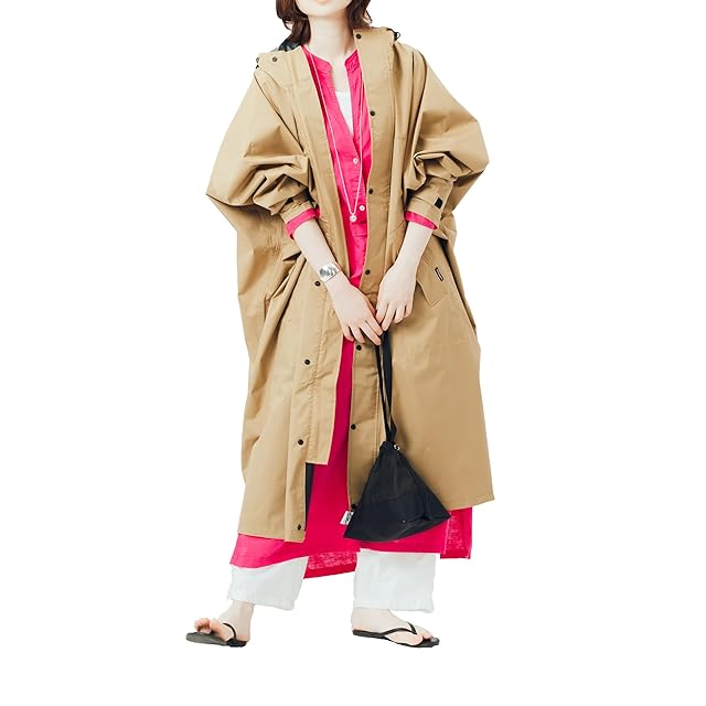 フルオープンできる前開きファスナーを設置し、脱ぎ着を楽にしました。ゆったりの身幅でリュックを中に背負うこともできるので、急な雨でもさっと着用が可能です(バッグの大きさによっては着用できない場合もございます)。持ち運びに便利な収納袋付きです。