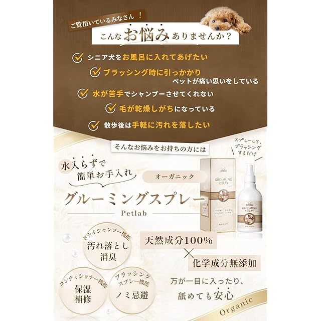 ?【動物看護士×トリミングサロンと共同開発】PETLABのグルーミングスプレーは数種類の既存のグルーミングスプレーを試した上で、「消臭」「保湿」は勿論、まるでサロン帰りのようなフワフワ感を実現する為に、成分を厳選し試行錯誤を重ねて仕立て上げました。ブラッシングを通じてネコちゃん・ワンちゃんの健康を保ち、仕上がりの“極ふわ感”を是非ご体験してください。お風呂やシャワーを使ったシャンプーが苦手な子やシニア犬・猫の清潔感を保つためにも効果的です。