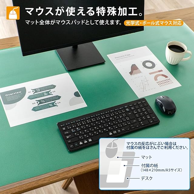 環境に配慮し再生材を使用したデスクマット / エコノミータイプ / マウス対応 / グリーンの下敷付き