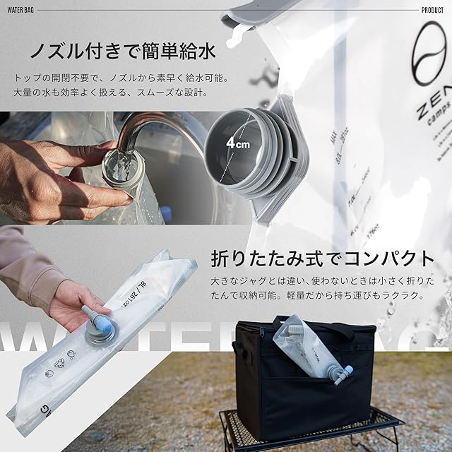 【コンパクト&超軽量】折りたたみ可能でコンパクト&超軽量。嵩張るウォータータンクやウォータージャグに比べ持ち運びが非常に楽です。ZEN Campsmのソフトコンテナにも収納可能です。