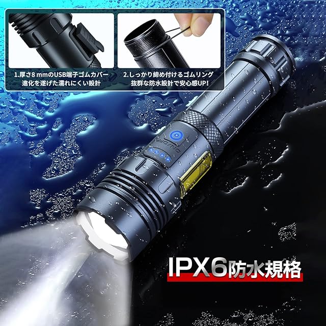 商品名:Eornmor 懐中電灯 強力【防災士監修・超高輝度・XHP160チップ】5000mAh 26650バッテリー付 軍用 最強 Type-C充電式/電池式 単4電池適用 ハンディライト COB作業灯 IPX6防水 7モード調光 ズーム式 耐衝撃 残量表示機能 作業用 停電 地震 避難対策 防災グッズ