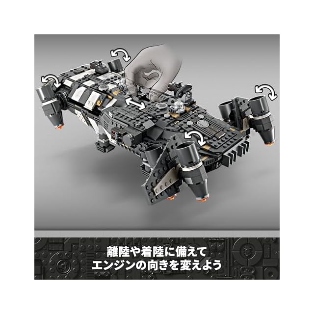 リアルなギミック – 操縦士を座らせられるコックピット、4体のミニフィギュアの座席がある乗組員室、離着陸と飛行のモード切り替えができる回転エンジン、スタッドシューター2台、それぞれに2台のスタッドシューターがついた回転式ミサイルランチャー2台