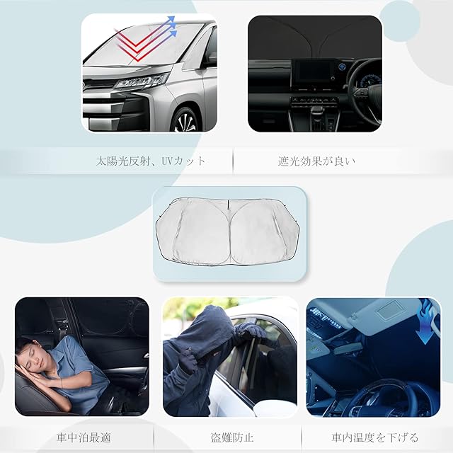 【日よけ対策&劣化防止】フロントガラス サンシェードはアルミホイル反射層を加工され、駐車時の日光から車を守り、車内部品を保護します。しっかり太陽光から車内を守ってくれるため、見た目だけじゃなく機能性もあり、夏場必須アイテム!!防犯対策、車内、屋外、お昼寝に最適!cdefg サンシェード voxy