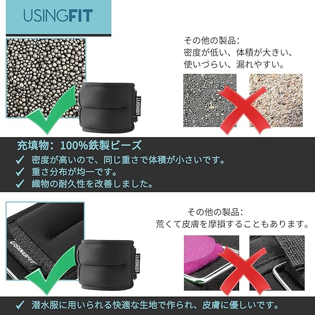 USINGFIT アンクルウェイト 足首 手首 重り おもり 筋トレ ウェイト リスト 2 * 0.5Kg / 2 * 1Kg / 2 * 1.5Kg / 2 * 2Kg 2個 四仕様 砂袋 トレーニング リストウエイト パワーリスト アンクル 男性 女性 子供 ハンドウエイト パワーアンクル (2 * 0.5kg)