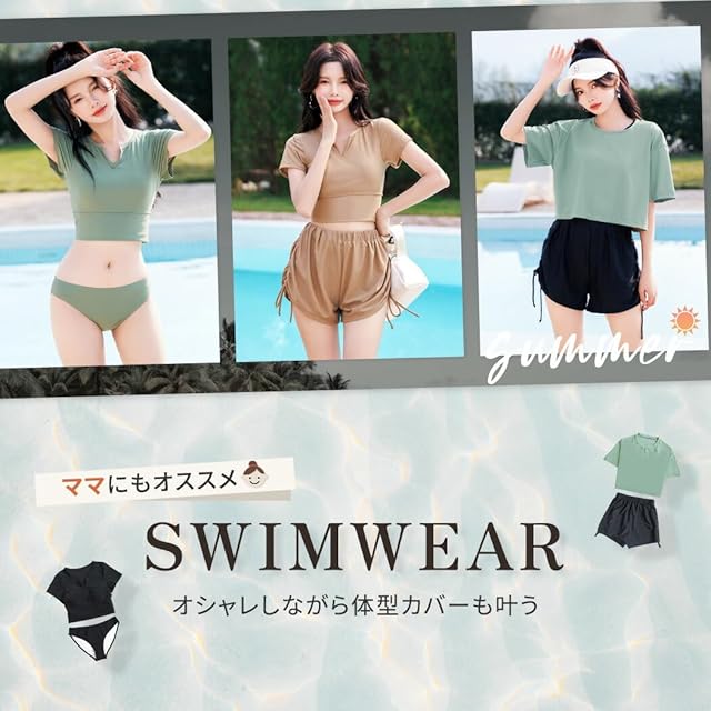 セット内容・4点セット ・ブラ一体型トップス ・ショーツ ・ショートパンツ ・シャツラッシュガード クロップド丈でトレンド感◎シンプルデザインでママさんにも◎ クロップド丈 おしゃれ かわいい 大人水着こなれ感 露出控えめ