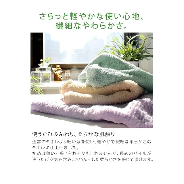 【軽やかで繊細なやわらかさ】通常のタオルより細い糸を使い、ロングパイルに仕上げています。密度を込ましすぎずに織り上げる事で、軽くて繊細なやわらかさのタオルになりました。はじめは薄いと感じるかもしれませんが、お洗濯をするごとにふわんとした独特の柔らかさを感じていただけます。