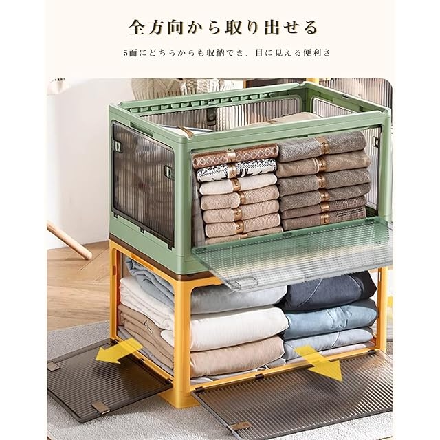 【5面開閉式×大容量収納】 「衣類/おもちゃ/布団収納に最適」 5面開閉式収納ボックスはどこからでも開けれるので詰める順番を考えずに、ポイポイ入れれるのが便利です。しかも大容量だから衣類やおもちゃ、布団まで色んな物がたっぷり収納できます。ボックスの天面に重い物も入れても、前、後、左、右から取り出せる可能です。一方向からしか取り出せない入れる伝統の収納ケースに比べて、使用頻度の低いものを取り出すのが不便になる心配はもうありません。こんな収納ボックスは本当に宝物です。