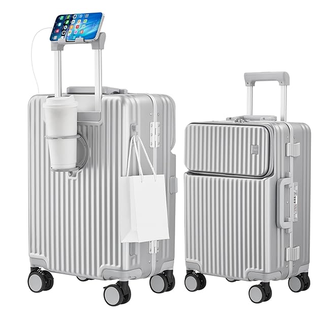 [Ashard] スーツケース 多機能フロントオープン キャリーケース ストッパー付き 機内持ち込み キャリーバッグ 携帯スタンド USBポート付き カップホルダー付き 隠しフック機能 超軽量 耐衝撃 静音 360度回転 ダブルキャスター アルミフレーム ピュアPC材質 大容量 TSAロック搭載 旅行 ビジネス 出張 (シルバー, Mサイズ /65L (4〜7泊))