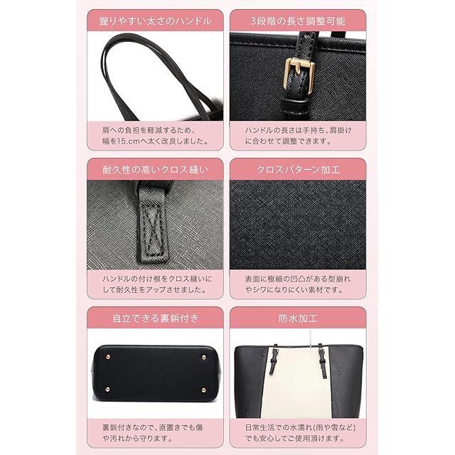【満足頂ける機能を揃えました】防犯面やプライバシー面を考慮した天面ファスナー、直置きでも傷や汚れからバッグを守る底面に鋲付き、一般的なPUレザーに比べて傷が付きにくく型崩れやシワになりにくいクロス(十字)パターン加工、一般的に日常で生活する際の水濡れなどなら守る防水加工、3段階に調整可能な持ち手。お好きなチャームが付けられるDリング。