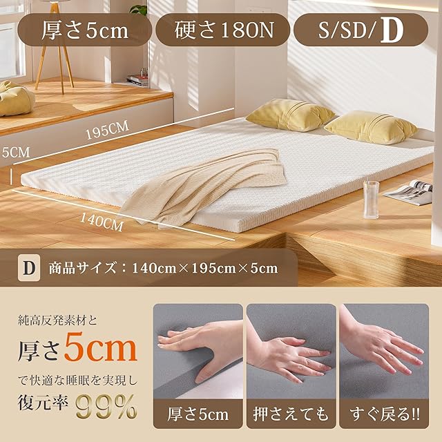 YOUZI 厚さ5cm マットレス ダブル 高反発 ベッドマット 硬さ180N 高密度 敷布団 抗菌防臭 洗えるカバー付き 圧縮梱包 140×195×5cm ホワイト