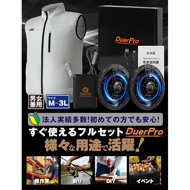 【空調ウェア ファン付きベスト で夏の作業効率向上!】個人様、法人様より毎年大好評の、空調ウェア ファン付きベスト フルセットが今年も登場!炎天下の中での作業、空調が使えない中での屋内などで大活躍!ベスト、静音ブラシレスファン、PSE承認10000mAhのバッテリーがセットになった、届いた日からすぐに使えるフルセットとなっております。誰でも簡単に取り付け、起動ができるスタンダードタイプになります。空調ウェア ファン付きベストは男女兼用なのでスタッフさん同士や家族内で使い回しができます!私たちは国内メーカーになります。不備や不明点がございましたら、お気軽にカートボックス下の「Duerfusa」から「質問する」よりご連絡ください。
