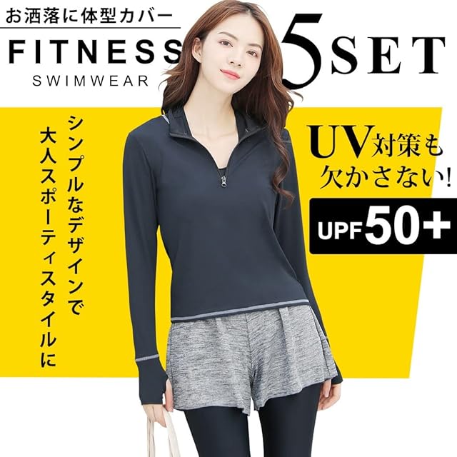 ・ブラック×グレーの大人シンプル感がクール!体型も見せない☆ フィットネス水着レディース 長袖トップス ジップアップ