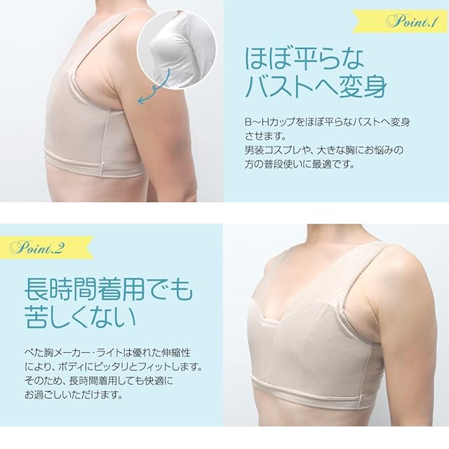ボリュームのあるバストをほぼ平らにメイク / 和装や男装・ボーイッシュなコスプレ・痩せ見せさせたい人の胸つぶしブラ / グラマーサイズでお困りの方の普段使いにもOK / 胸が大きくても色々な服が着れる / ジョギングなどの運動時、胸の揺れが気にならない / 伸縮性に優れた生地で長時間着用しても苦しくない / 通気性に優れたメッシュ素材 / 脇肉・背中肉をスッキリ補正 / 安心の日本製 / トランスジェンダーも応援します / ≪「ぺた胸メーカー」と「ぺた胸メーカー ライト」の違いについて≫「ぺた胸メーカー」と「ぺた胸メーカー ライト」は生地が違います。「ぺた胸メーカー」は、ヘムサテンを使用。「ぺた胸メーカー ライト」は、パワーネットを使用しておりメッシュ調です。また、メッシュ調のため通気性も良く同じ特許製法ですが、より胸がつぶれるように開発されています。本来ブライダルインナーなどに使われる肌触りが良く段差が出にくい生地を使い、作り上げたこだわりの商品です。