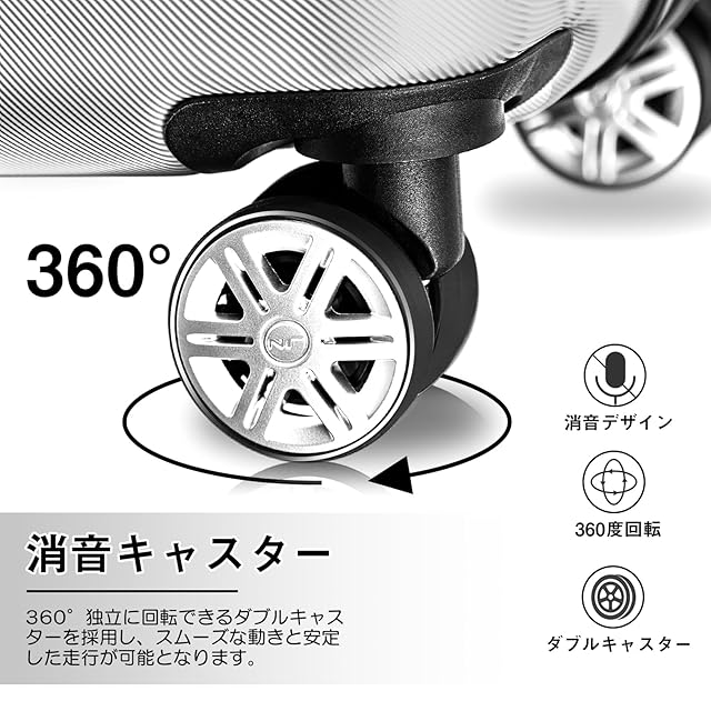 【超静音ダブルキャスター&安心のTSAロック】360度回転可能の8輪ダブルキャスターは、静音と耐久性抜群で、凸凹道でもスムーズに走ることができます。また、世界基準のTSAロック搭載しています。アメリカ空港(グアム・ハワイ・サイパン含む)では必需品です。ダイヤル式ロックなので鍵を無くす心配がないのも魅力です。