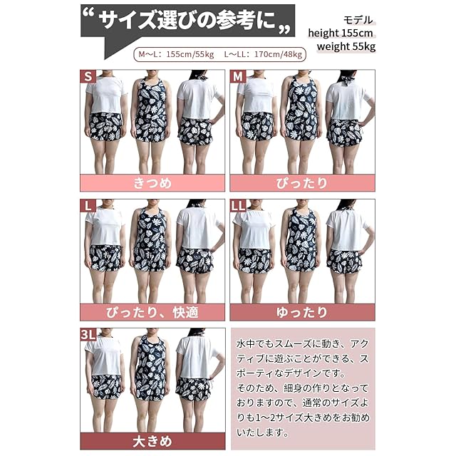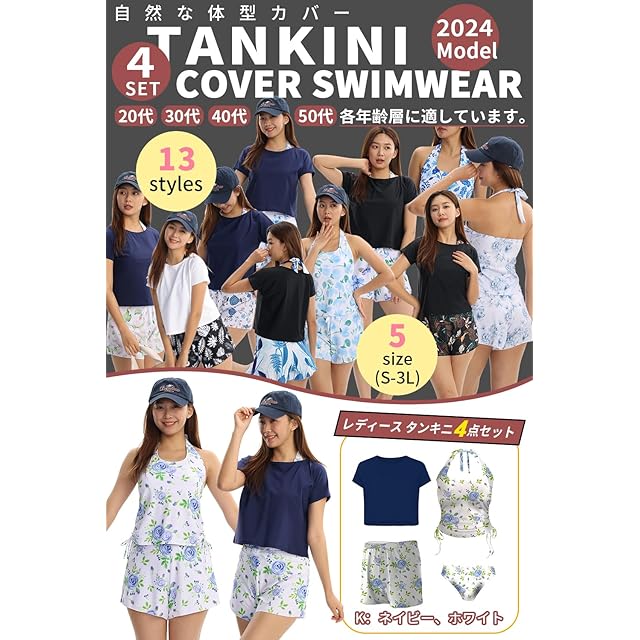 【適用対象】体型カバーが楽ちんなタンキニ4点セット、水着経験が少ない方や露出を控えたい方に最適、3WAYで着こなせて、ティーンからママまで幅広く使えるアイテム。