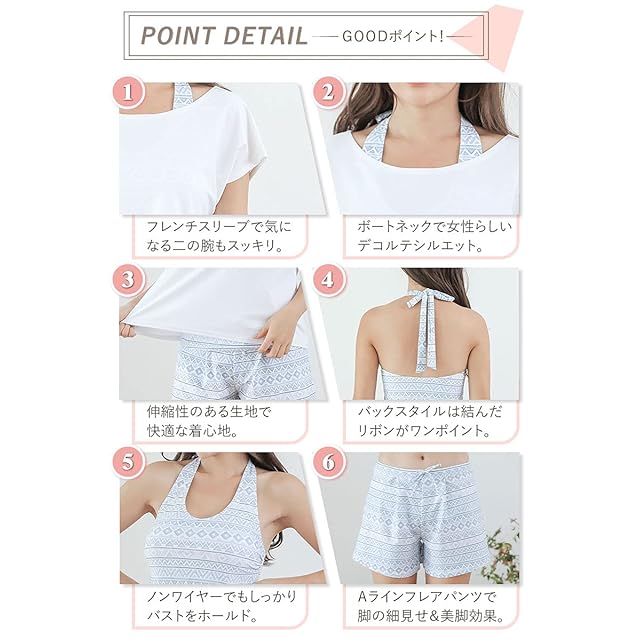 ?【 伸縮性抜群!水着生地 】伸縮性のあるこだわりの水着素材で、締め付けず着心地抜群!動きを妨げず身体にフィットします。※素材構成: 84% ポリエステル, 16% ポリウレタン ?【ノンワイヤーカップでストレスフリー】タンキニのブラカップはノンワイヤーでストレスフリー!カップがしっかりはいっているので、安心してアクティビティも楽しめます。?【着たまま水の中に入れます!】オーバーTシャツ、タンキニ上下、フレアパンツは全て水着素材。全て着用したまま、水に入れます。