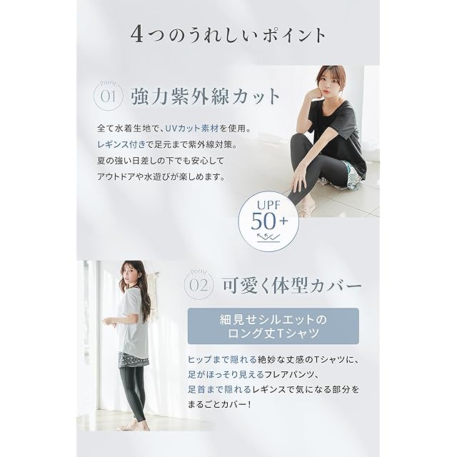?【嬉しい充実の4点セット】オーバーサイズTシャツ、タンキニ上、ウエストシェイパーレギンス・フレアパンツの体型カバー水着4点セット。 ?【普段着のように着れるデザイン】全て着用すればまるで洋服のようなオシャレなデザイン。オーバーサイズのTシャツはバック部分が長めのデザインでヒップもしっかりオシャレにカバー!黒のレギンスで足先まで紫外線もカットできる優秀デザインです。