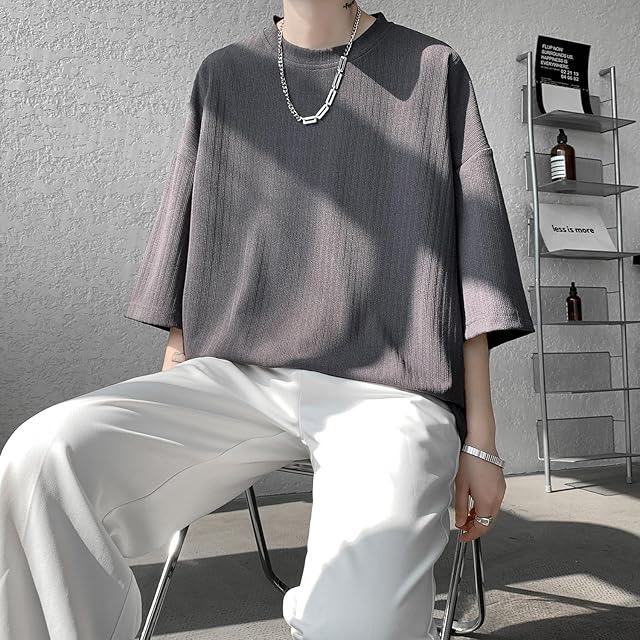 [Fasshonrida] 七分袖 メンズ tシャツ おしゃれ 縦縞ジャガード 半袖 ティーシャツ 涼しい 夏服 人気 無地 ロンt 大きいサイズ てぃーしゃつ しちぶ袖 トップス かっこいい 服 オシャレ ストライプ柄 tshirt 春 夏 ink L
