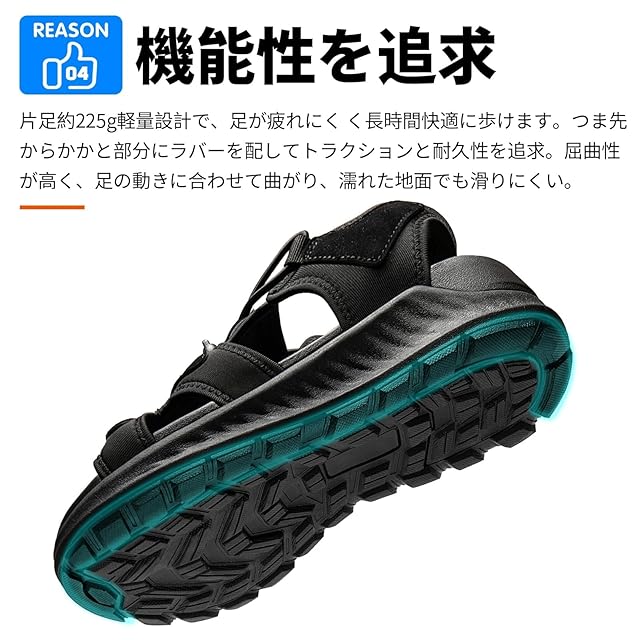 3.凹凸が地面をしっかり掴み滑りにくくて安心!靴底は滑り止め加工が施されているので濡れた路面でも安心。足と共に動くから歩行をきちんとサポート。水辺のシーンでも活躍します。