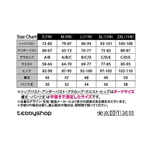 Teddy's MIZUGI SIZE M(9号) トップバスト 79-87cm アンダーバスト 65-72cm ブラカップ Bカップ/Cカップ/Dカップ ウエスト 64-70cm ヒップ 87-95cm 着丈 47cm パンツ丈 32cm