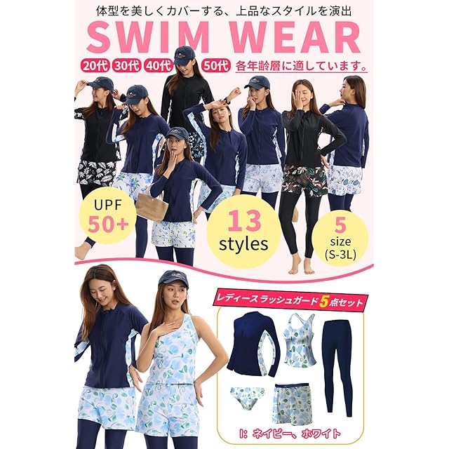 [Wotivon] 水着 レディース 体形カバー 5点セット ラッシュガード フィットネス水着 UPF50+