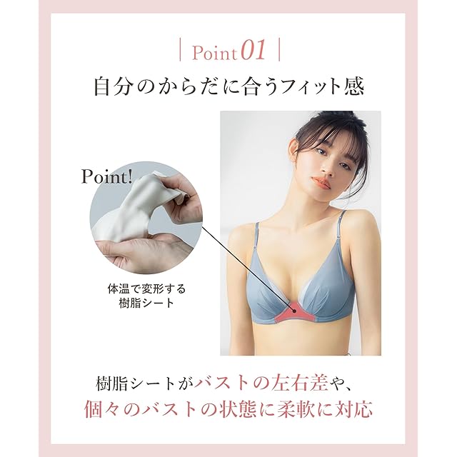 【自分のからだに合うフィット感】フロント下部の「体温で変形する樹脂シート」がバストの位置に合わせて伸縮して、ここちよくフィット