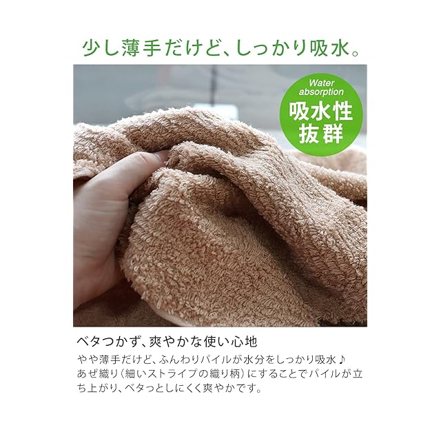 【速乾で衛生的】ちょっと薄手の速乾タイプ。乾きが早く、清潔で衛生的です。毎日使いにちょうどいいデイリータオルです。あぜ織(細いストライプの織り柄)を入れているので、細番手のパイルがふんわりと立ち上がり、顔を拭いてもべたっとしにくく心地よくお使いいただけます。