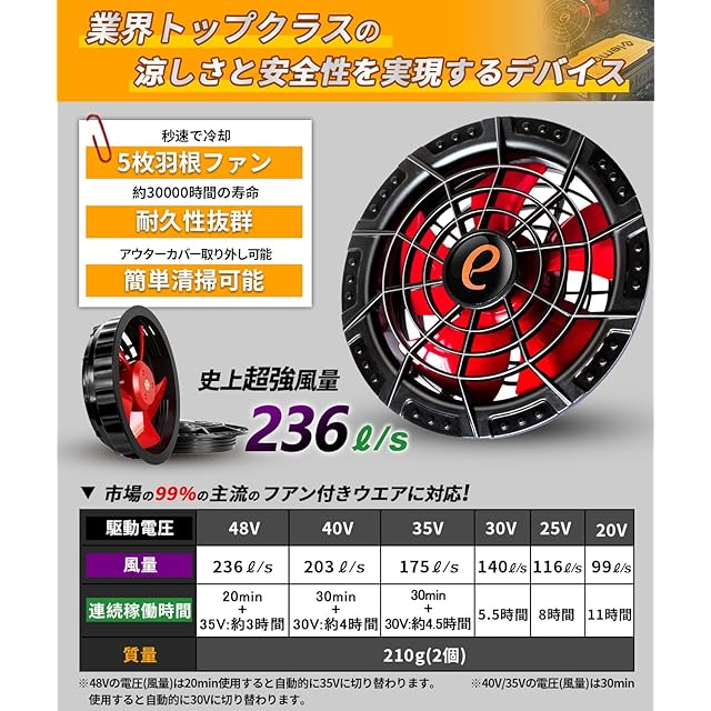 【シリーズ史上、最もパワフルな風量を】2025年最新モデルに搭載された新型高性能暴風ファン。48Vで最大236L/Sの風量を実現、瞬時に冷却!48Vから20Vまで、6段階風量切替もご用意!新開発の高性能ファンは、上質な全銅芯ブラシレスモーターを採用し、優れた省エネ性能を実現。ABS素材を使用した5枚羽根のファンが、安定した涼しい風を提供します。