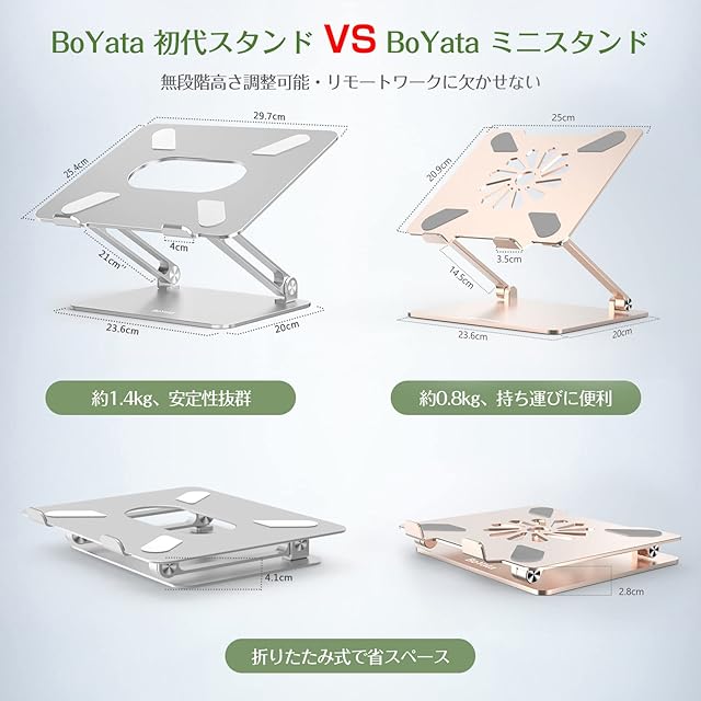 【軽量化の設計・デスク環境を改善】PCスタンドとタブレットの接触面のサイズ:約250mm×210mm;底板のサイズ:237mm×199mm。0.8kgの重量はBoyata 従来の同シリーズのノートパソコンスタンドより大幅に軽量化!年齢問わず、学生から高齢者まで、在宅勤務、リモート授業、勉強、読書など幅広く活用できます。PC作業で目が疲れやすい、猫背、肩こり、首周りが痛みがち、集中力低下などに心当たりのある方におススメです。