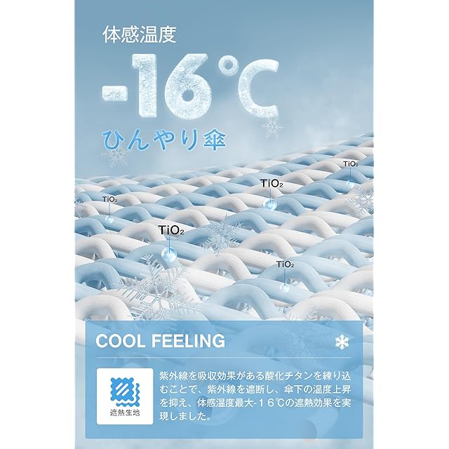 ☂【100%紫外線遮蔽 &-16℃の遮熱効果】✅JIS規格試験で⭐遮光率100%・UVカット率は全色100%、UPF50+(国内第三者検査機関による確認済み✅)!日焼けを防ぐために必要なUVカットの性能を兼ね揃えた、紫外線対策にはピッタリの折りたたみ日傘です。さらに涼しく過ごすための遮熱性も重視、断熱素材「酸化チタン」を練り込んだ素材を使用しています。✅開いたら、傘下温度の上昇を抑え、最大-16℃の遮熱効果を実現しました❗❗ 涼しい傘は暑い夏の熱中症対策にもぜひおすすめ!