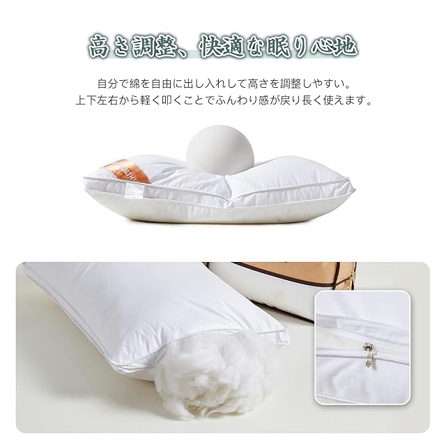 【高さ調整】柔らかいのに適度な弾力があるので、しっかりと頭を支え、寝姿勢をサポート、朝までぐっすり!また、低めの枕がお好みの方は、ファスナーを開けてから、綿の出し入れでお好みの高さでできますように 調整することがますす。
