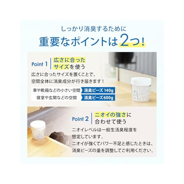 【消臭に大事な2つのポイント】 ●ポイント1:”広さに合った”サイズを使うことで、空間全体に消臭成分が行き届きます。 ●ポイント2:”ニオイの強さ”に合わせて使うことが重要です。ニオイが強くパワー不足と感じた時は、消臭ビーズの量を調整してご利用下さい。