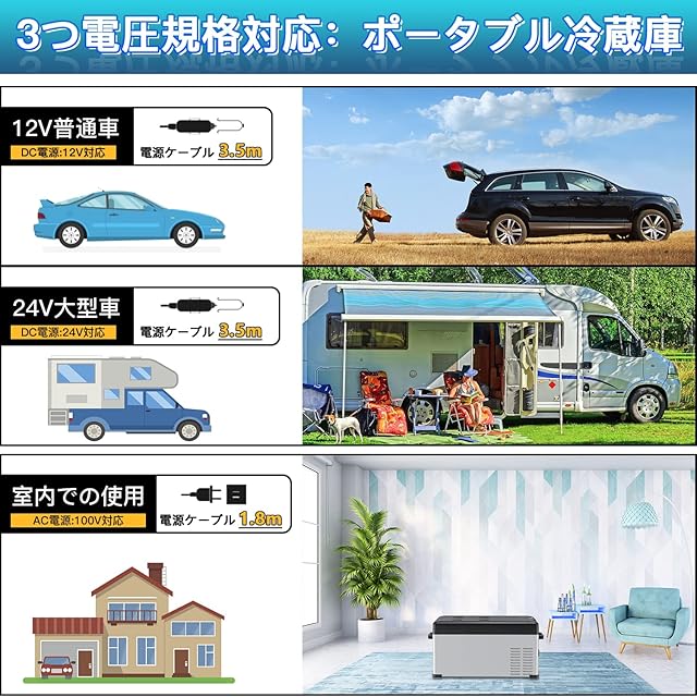 【ドライブ旅に大活躍】ポータブル冷蔵庫は2種類の電源ケーブルを付属し、車載DC12V/24V&家庭用AC100V電源に対応できます。稼働時騒音ほぼなし、運転時の激しい振動でも問題なく稼働可能。更に、庫内にLEDランプ完備、車中泊、長距離運転時にピッタリ。