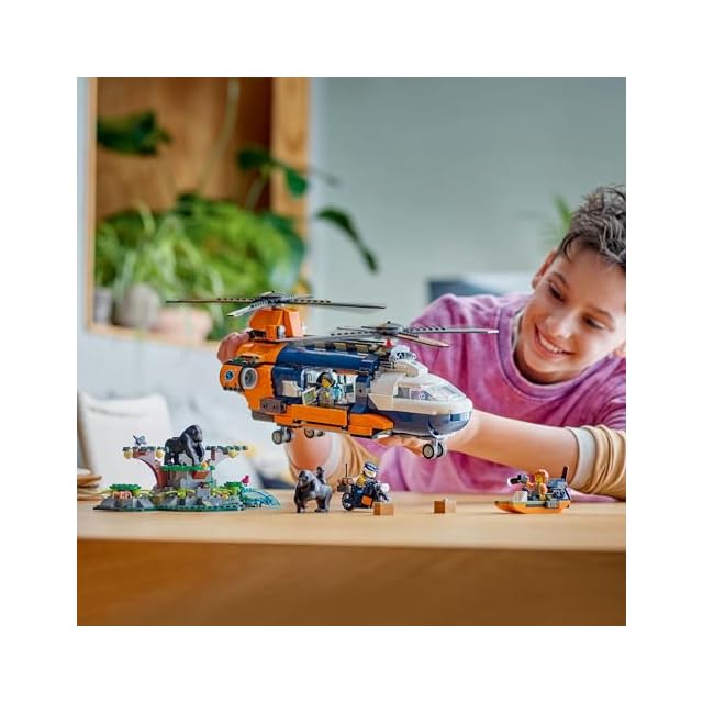 セットの内容 – ツインローター貨物ヘリ、バイク、沼地用ボート、ジャングルのベースキャンプの組み立てに必要なパーツと、探検家のミニフィギュア5体、ゴリラのフィギュア3体