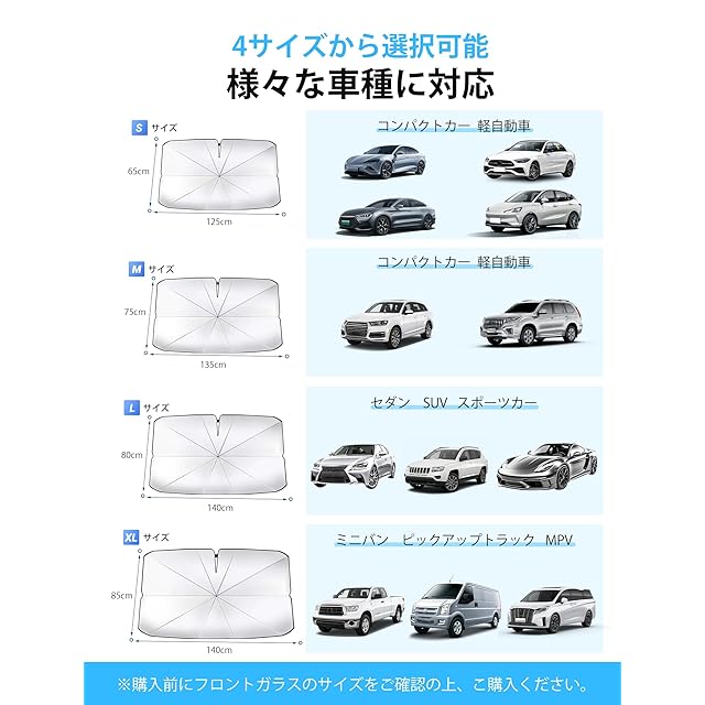 【4サイズ・様々な車に対応可能】Sサイズ(125*65cm)は軽自動車、コンパクトカー(SUVなど)に適用されます。Mサイズ(135*75cm)はセダン、コンパクトカー(SUV)、スポーツカーなどに適用されます。Lサイズ(140*80cm)はミニバン、商務車MPV、中大型SUVなどに適用されます。XLサイズ(145*85cm)は大型SUV、中型トラックに適用されます。(ご注意:ご購入前にぜひ愛車のフロントガラスサイズをご確認ください。手動でサイズを測定し、1~3 cmの間違いがある場合があります。)