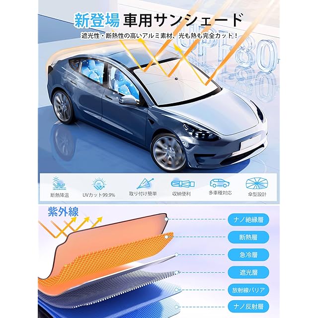 【遮光遮熱&内装劣化防止】 傘面は6層ナノ高分子断熱材料を採用、外側はチタンシルバー接着剤がコーティングで、強い日差しを反射して、車内温度の上昇を抑え、エアコンへの負荷が減り、省燃費も向上させます、快適な車内空間を実現します。99%の有害な紫外線を遮断することもでき、駐車時大事な愛車を太陽光による損傷やハンドル焼け、ダッシュボードなどの樹脂部分の日焼けから守り、内装の劣化を防止し、使用寿命を延長します。光の眩しさを抑え、車内の温度を下げることで、昼寝中に快適な環境を提供し、車中泊にも利用できる。