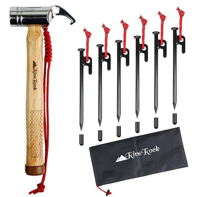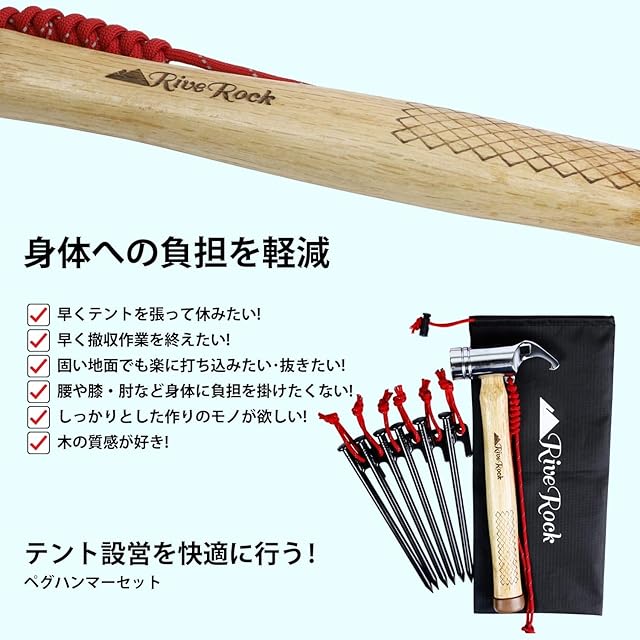 RiveRock(リバロック) ペグハンマー 収納袋 安全キャップ付き ペグ6本 夜光ロープ 強靭 (ハンマーペグ6本+バック/レッド)