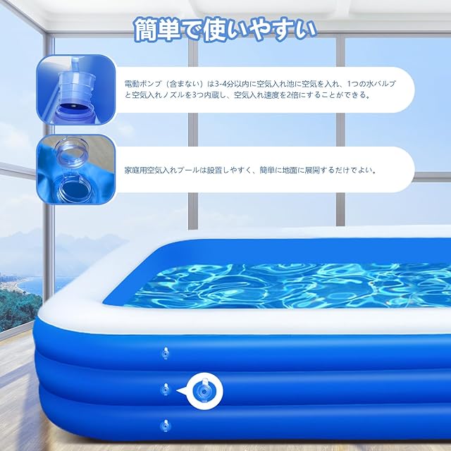 【3つ独自気室&使用便利】ビニールプールは上下で別れた3気室タイプなので、空気の偏りが起きにくく、水を入れても安定しています。大人が腰掛けることも可能です。小さいお子様がいる場合は、一層または二層だけ空気を入れると、低い水位でも楽しめます。また、二重バルブ構造で、万が一外蓋が開いても空気が漏れにくいので安心です。底面には排水ホースも付いており、排水がスムーズで後片付けが簡単です。このファミリープールは、空気の偏りが起きにくく、水を溜めても安定した設計です。❊空気入れ道具は含まれていません。