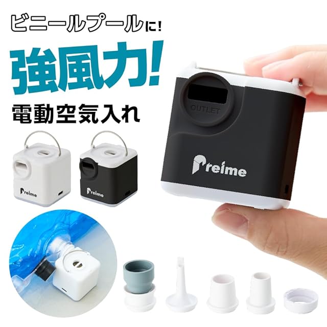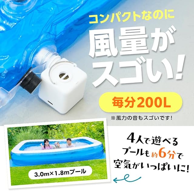 【 電動空気入れ 】電動空気入れは数多く御座いますが、弊社の電動空気入れはここが違います!1.空気入れがラクラク!ハッピーファミリープールだけでなく、他社のプールや浮き輪など様々なビニールタイプ商品に使えます。電動式で簡単にすばやく空気を入れることができるので、暑い夏をより楽しめます。2.用途に合わせて使用可能!専用のノズルを使用することで、小さめの浮き輪から大型のビニールプールまで用途に合わせて空気を入れることができます。キャンプライトとしても使うことができるので、アウトドアにピッタリです。3.電源はコンセントを利用!ご自宅のコンセントに差すだけの簡単操作です。空気入れ本体は手のひらサイズなので持ち運びもラクラク!