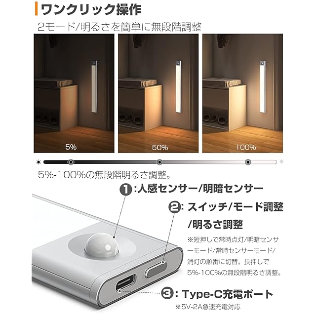 【素人でも簡単に操作できる】①一回ライトの側面にある電源ボタンを押して常時点灯モードに入り、緊急時は懐中電灯としても利用頂けます。発光面にある調色ボタンを押す度に3段階の色温度も調整することが出来ます。②再度電源ボタン短押しでインジケーターが緑色に4回点滅し、夜間センサーモードに入ります。明るい環境では消灯しますが、暗い環境(寝室/廊下/玄関/押し入れ...)で人が通うと自動点灯し·人が離れた後約20秒後自動消灯します。③再度電源ボタン短押しでインジケーターが赤色に1回点滅し、ライトは消灯します。それぞれの照明モードは必要に応じて選択しましょう。